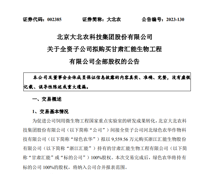 10月25日,大北农发布关于全资子公司拟购买甘肃汇能生物工程有限公司全部股权的公告。