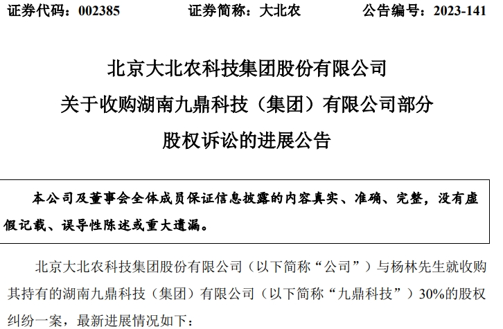 日前,大北农收购九鼎科技案继一审后二审再次败诉,湖南省高级人民法院驳回上诉,维持原判,此外,二审案件受理费539万元,由北京大北农科技集团股份有限公司负担。