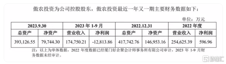 截至三季度末,截至今年三季度末,傲农投资总资产约39.3亿元,净资产约8.0亿元。今年前三季度,傲农投资实现营业收入约17.5亿元,实现净利润约-1.3亿元。