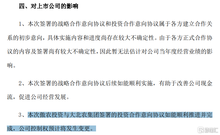 本次傲农投资与大北农签署的投资合作意向协议如能顺利推进并完成,傲农生物的控制权预计将发生变更。