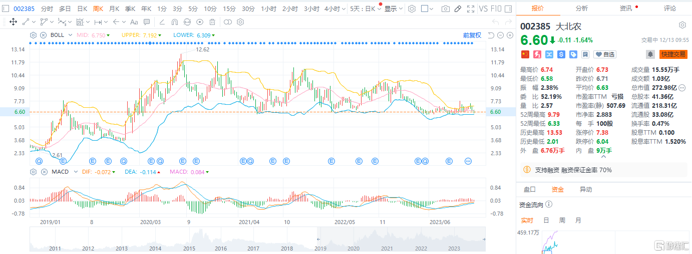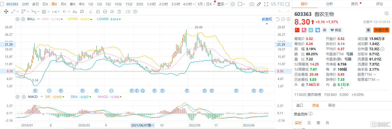 截至发稿,大北农跌1.64%,报6.60元/股,总市值272.98亿元;傲农生物涨近2%,报8.30元/股,总市值72.3亿元。