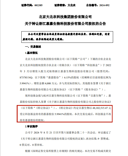 此外,大北农还有一则《关于转让浙江惠嘉生物科技股份有限公司股权的公告》值得关注。