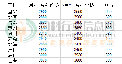 工厂在成本大幅上行且豆粕供应紧张预期情况下,实施限量销售且出现坐地等待涨价的情况,豆粕价格上涨幅度较为明显。据饲料行业网统计数据显示,近期豆粕持续上涨,较1月9日前后的低点上涨较为明显,在不到一个月的时间内上涨最低490元/吨,最大达650元/吨。