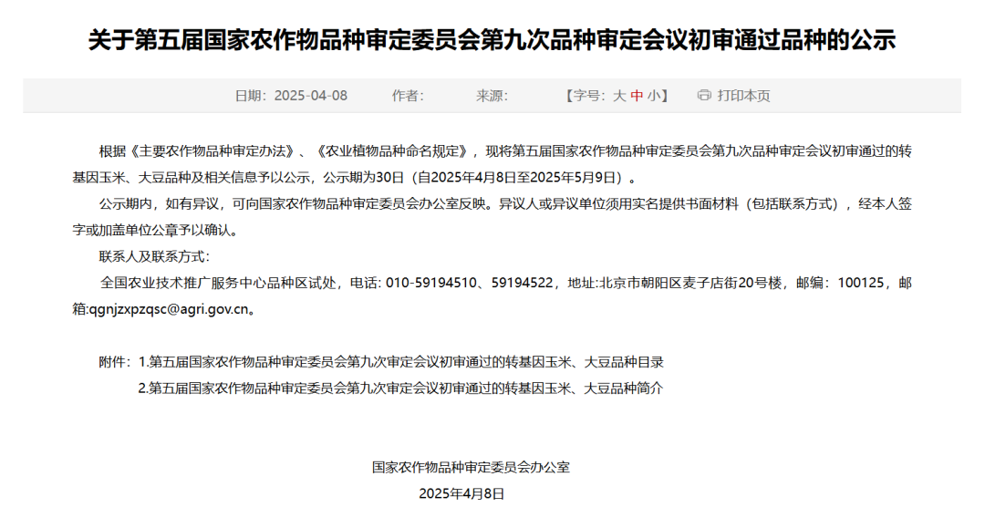 4月8日,农业农村部发布《关于第五届国家农作物品种审定委员会第九次品种审定会议初审通过品种的公示》,公示了会议初审通过的转基因玉米、大豆品种目录,共有97个转基因玉米品种和2个转基因大豆品种。