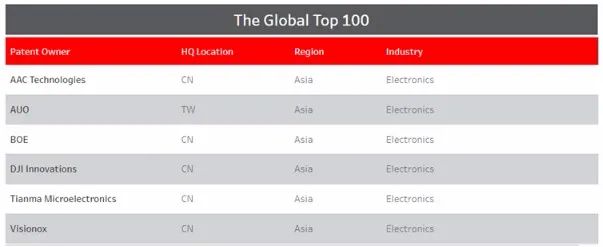 百强榜中48家公司来自美国,19家公司来自欧洲、中东和非洲,33家公司来自亚洲。其中,来自中国的华为、瑞声科技、大疆创新、宁德时代、京东方等19家企业脱颖而出入选百强。