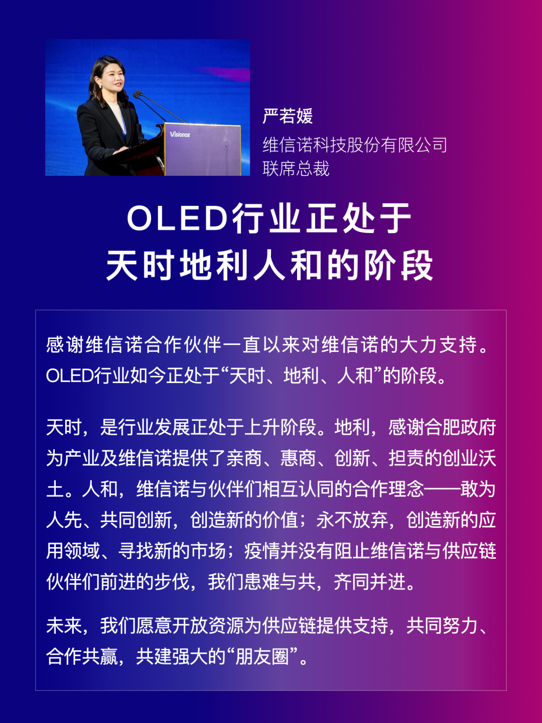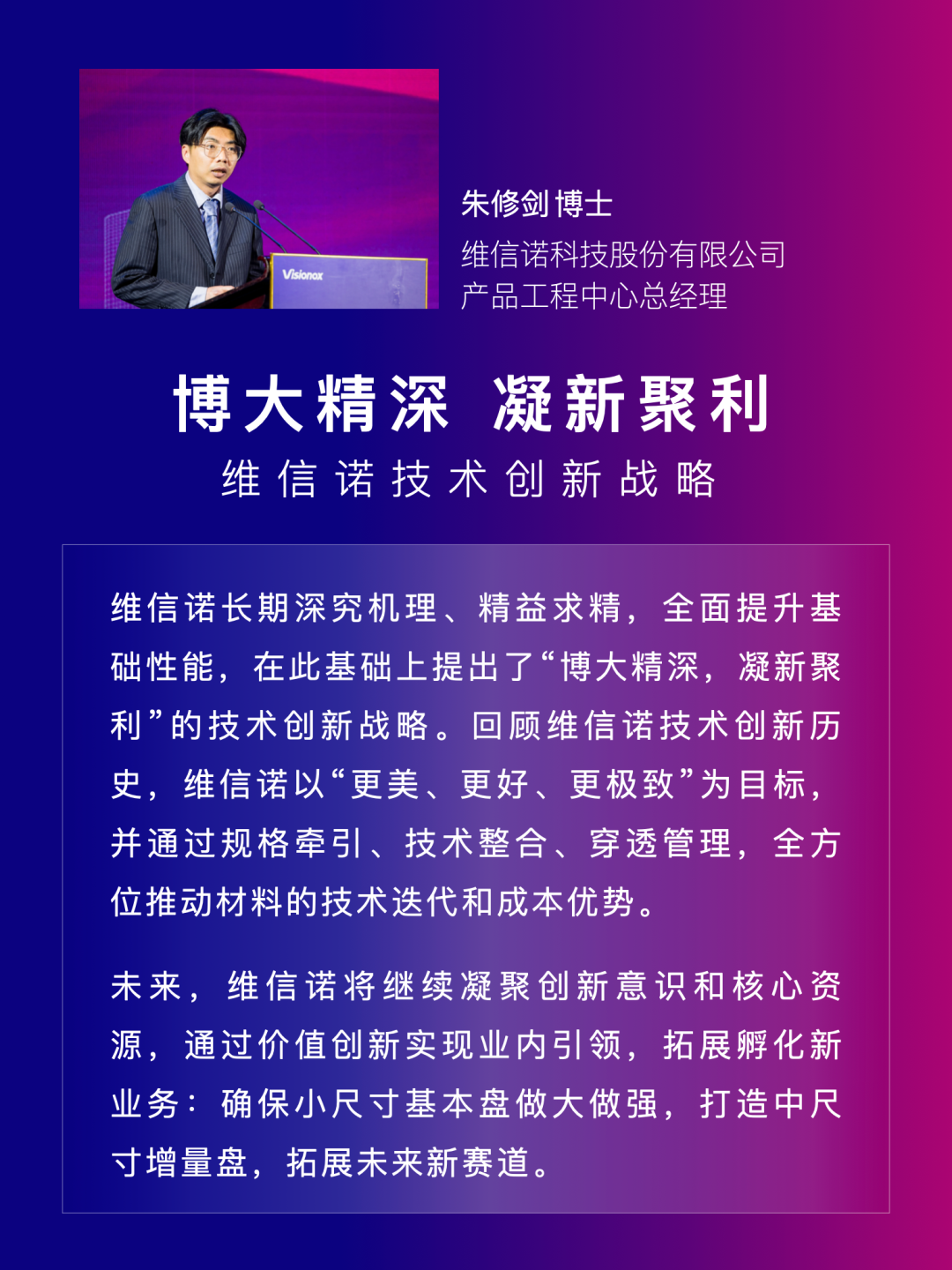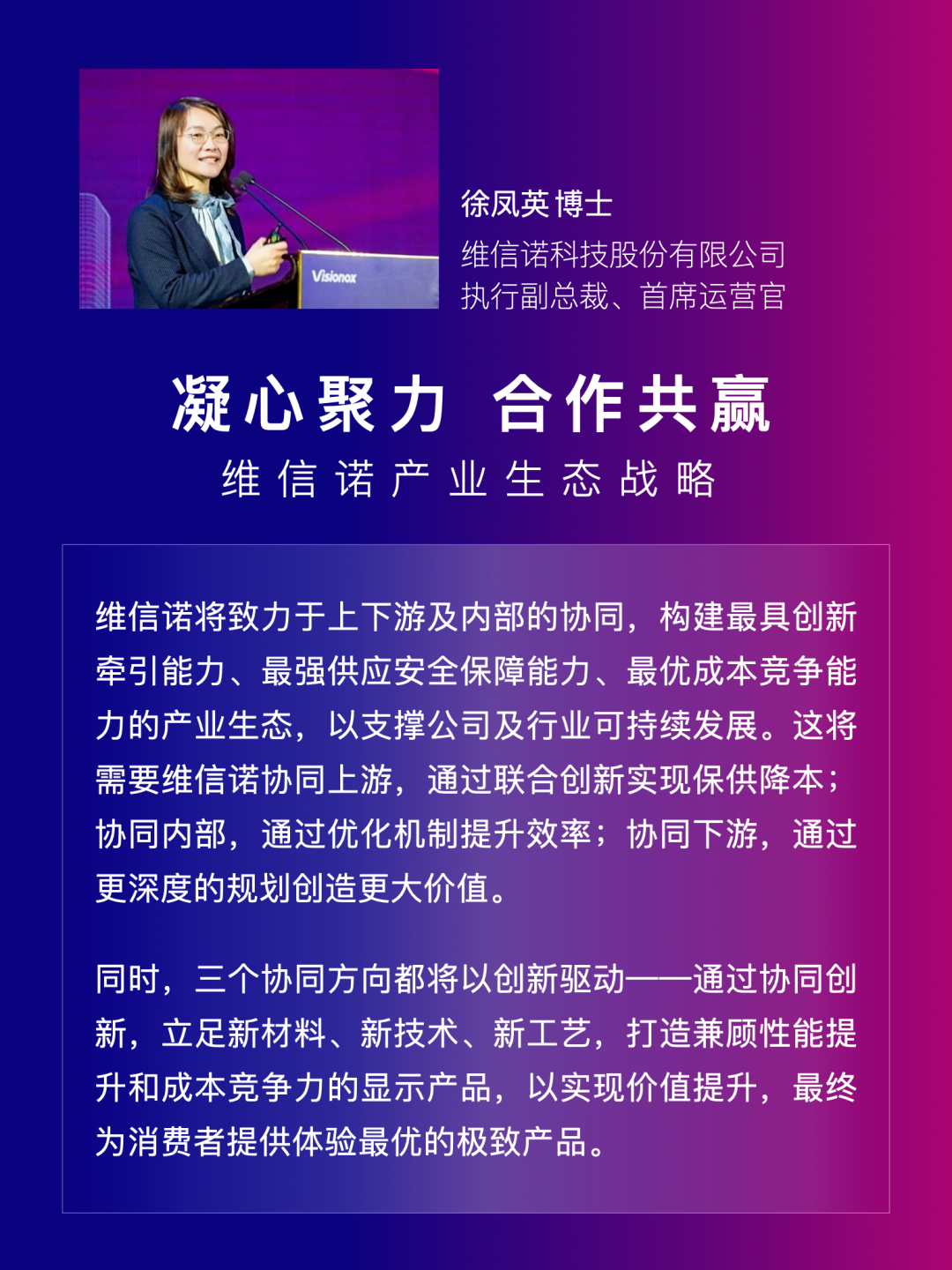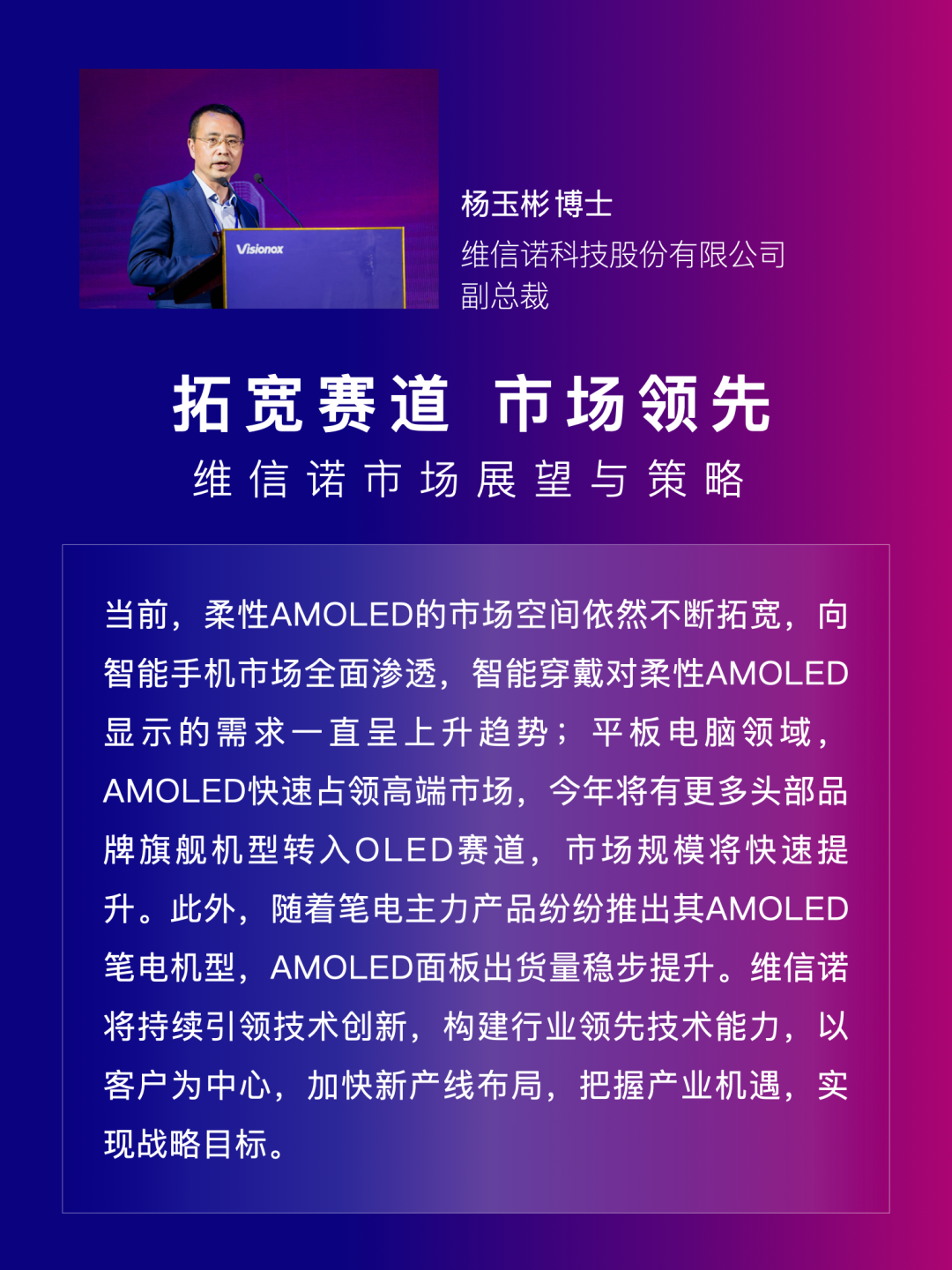 大会中,维信诺发布了产业生态战略、市场展望与策略、技术创新战略三项报告。