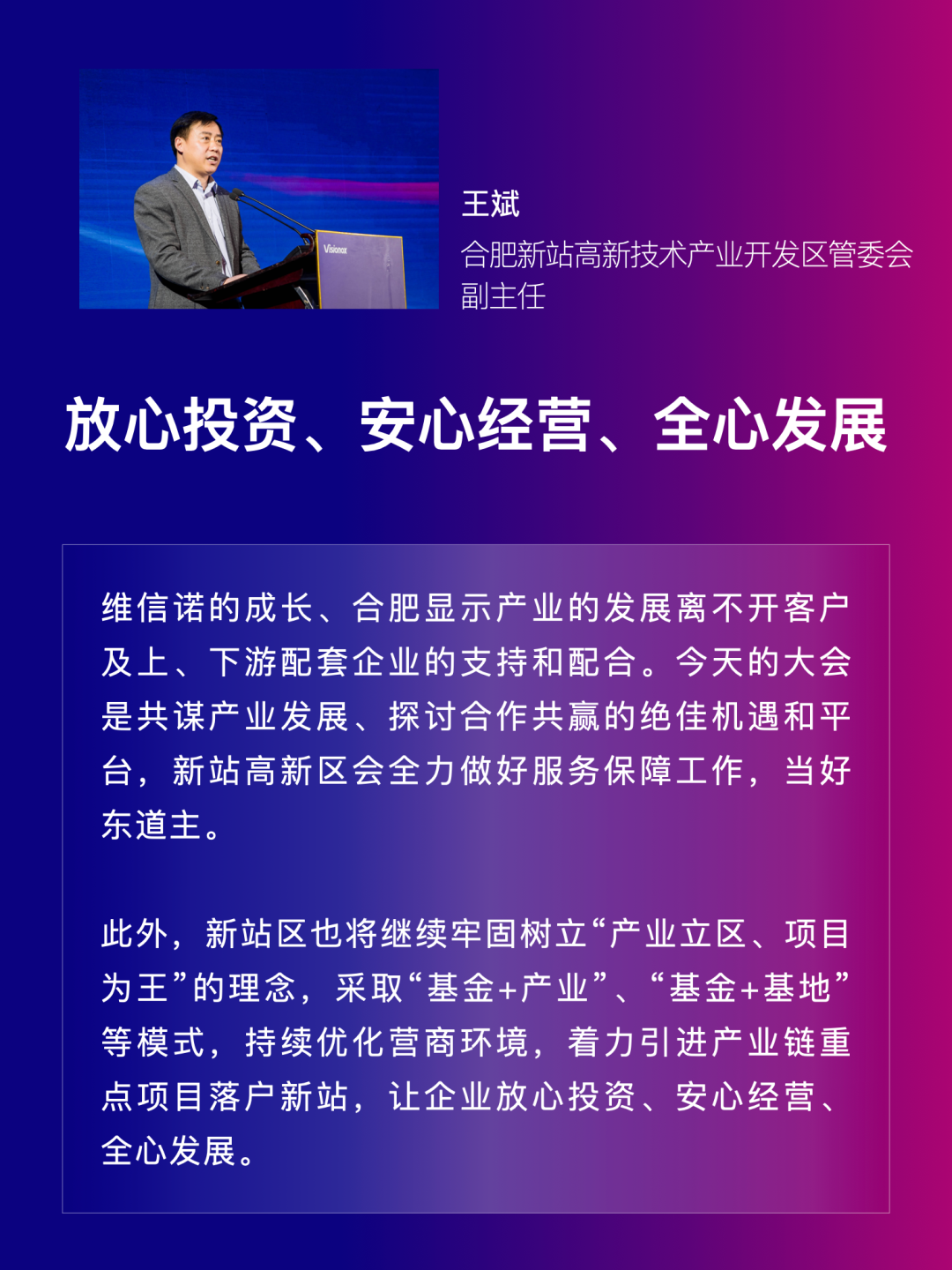 合肥新站高新区管委会副主任王斌,维信诺董事长、总裁张德强博士,维信诺联席总裁严若媛分别致开场辞。
