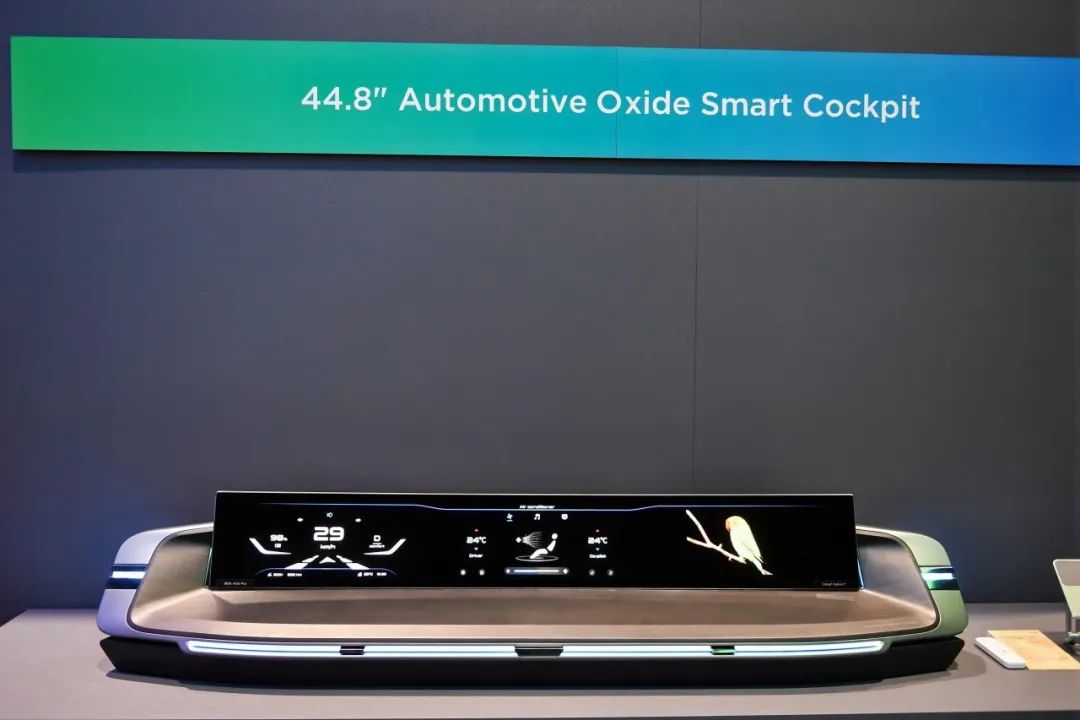 另外一款全球首发的京东方44.8英寸车载超大尺寸氧化物智能座舱同样亮点十足,搭配玻璃基MLED背光可实现百万级对比度和2000nit高亮画质。