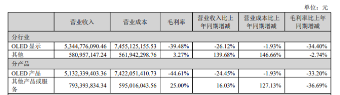 在2023年年报中,维信诺表示,报告期内,消费电子终端需求承压,AMOLED产能进一步释放,产品价格出现较大波动,行业利润处于低位水平。维信诺没有LCD面板业务,全部都是OLED面板业务。作为收入的支柱产品,2023年,维信诺OLED产品的毛利率为-44.61%。