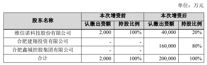 相关增资完成后,作为该生产线项目投资、建设、运营平台的合肥国显,维信诺的持股比例将从100%降至20%,合肥建祥投资和合肥鑫城的持股比例为80%。