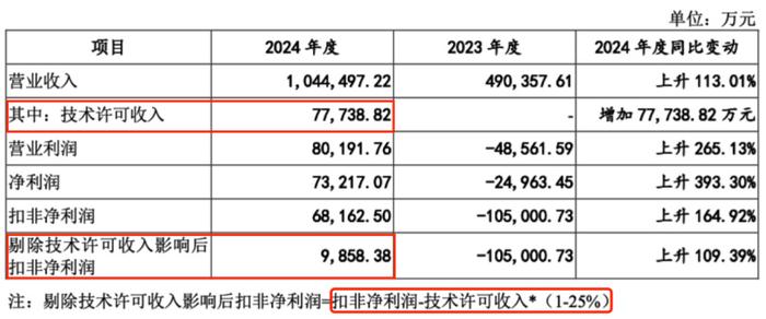 值得一提的是,标的公司2024年虽然扭亏为盈,实现了7.89亿元净利润,但该年度标的公司通过向关联方提供技术许可服务获得了7.77亿元收入,其中:向合肥维信诺电子确认技术许可收入2.11亿元,向合肥国显确认技术许可收入5.66亿元。剔除技术许可收入影响后的扣非净利润仅9858万元。