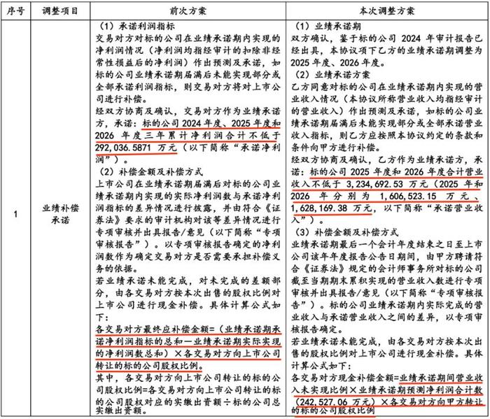 在调整后的方案中,改为承诺2025年和2026年的营业收入合计不低于323.47亿元,这是基于对标的公司2025年、2026年的业绩预测数。