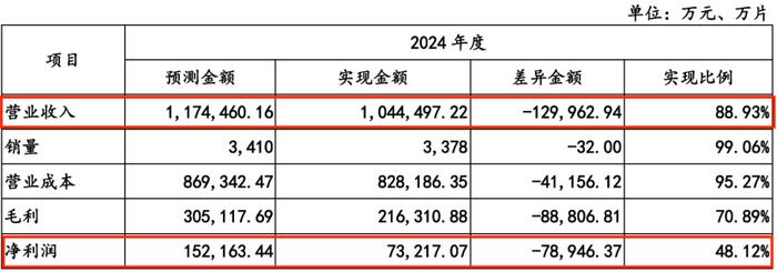根据原先的评估报告对标的公司2024年业绩的预测,当年标的公司应实现营收117.45亿元、净利润15.22亿元,而最终实现比例仅分别为88.93%、48.12%。