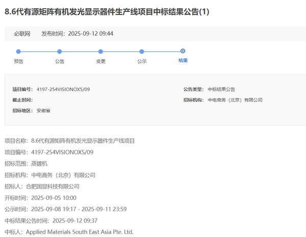 近期,维信诺(002387.SZ)布局的第8.6代AMOLED生产线项目迎来新进展,多项重要设备采购已确认中标方。根据必联网信息显示,合肥国显科技有限公司(下称"合肥国显")负责建设的8.6代AMOLED生产线项目的蒸镀机、曝光机、磁控溅射设备等设备公告了中标结果。