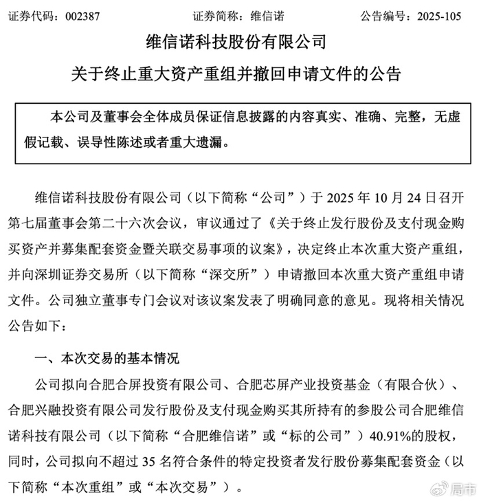 10月24日晚间,维信诺(002387.SZ)发布公告,宣布终止收购参股公司合肥维信诺40.91%股权的重大资产重组,并向深交所撤回申请文件。