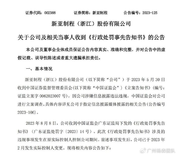 2023年8月9日,新亚制程公告称收到中国证监会广东监管局下发的《行政处罚事先告知书》。