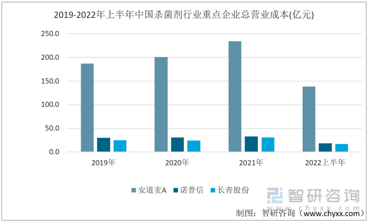 2019-2022年上半年中国杀菌剂行业重点企业总营业成本(亿元)