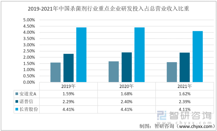 从研发投入情况来看,2019-2021年安道麦A的研发投入资金始终高于企业两家,诺普信的研发投入在三家中最低。2021年安道麦A的研发投入资金达5.01亿元,较上年增长了0.22亿元;2021年诺普信的研发资金达1.07亿元,但是较上年下降了0.08亿元;2021年长青股份的研发投入为1.55亿元,比上一年度增长了0.22亿元。从研发投入占营业收入比重情况来看,2019-2021年安道麦A、诺普信、长青股份的研发投入占营业收入的比重区间分别为1.59%-1.68%、2.29%-2.40%、4.11%-4.41%;其中,长青股份其占比最大,研发投入强度更大。