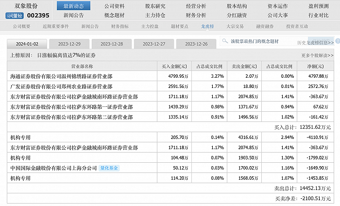 其实,1月2日盘后的龙虎榜显示,虽然当天是涨停,但买卖前五的净差为负值:-2100.51万元。卖出前五席位中,有3个席位是“机构专用”,另外两个席位一个是东方财富证券拉萨金融城南环路营业部,另一个是中金公司上海分公司。