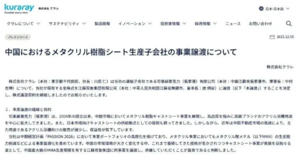 近日,可乐丽株式会社宣布,已决定将所持有的全资子公司可乐丽亚克力(张家港)有限公司的全部股份转让给 江苏双象集团有限公司 ,并已签署股份转让协议,预计转让时间在2026年2月中旬至3月上旬。