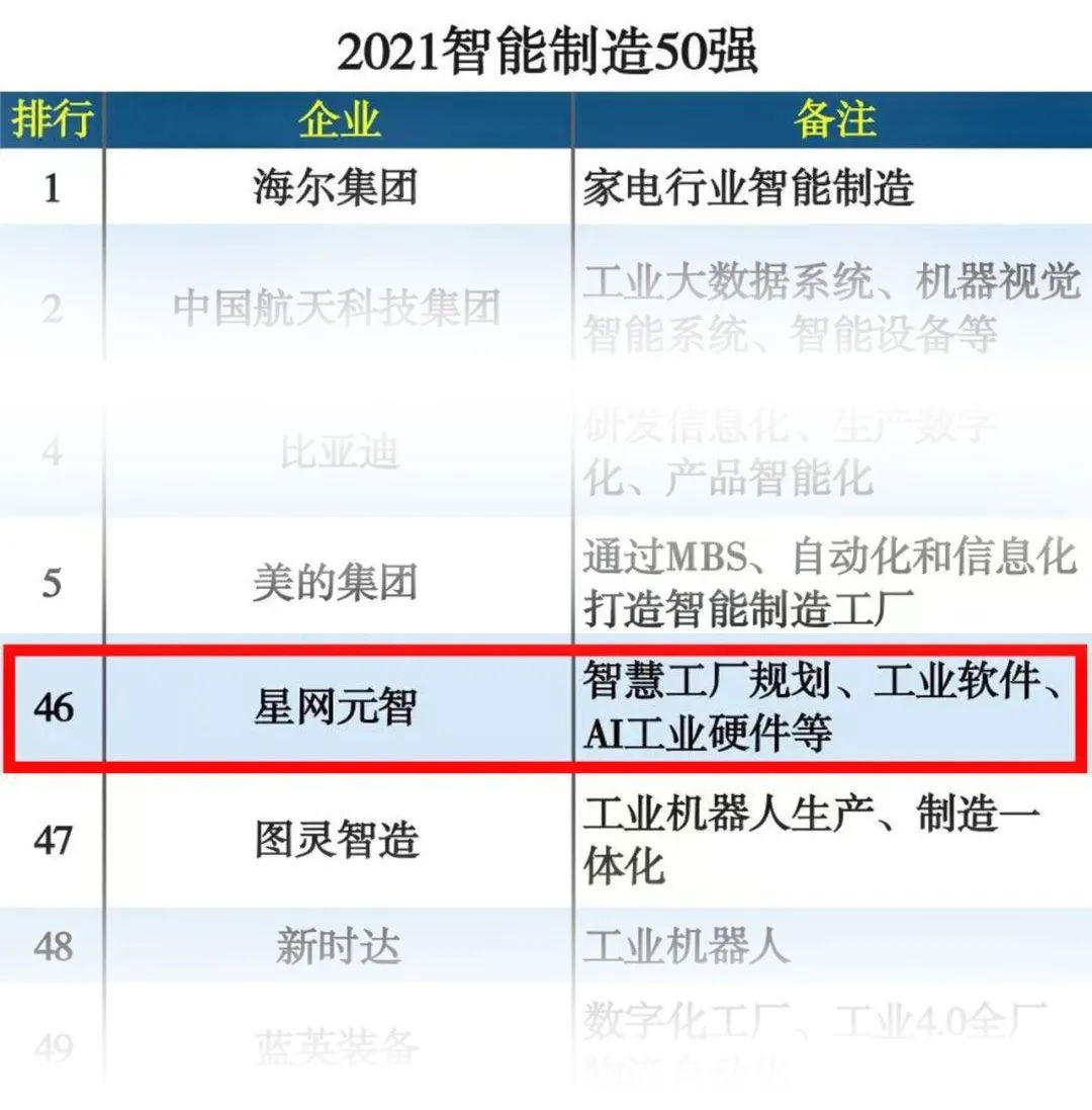 近日,互联网周刊发布了由“互联网周刊、eNet研究院、德本咨询”联调评选的“2021智能制造50强榜单”,星网锐捷旗下智能制造企业星网元智凭借“智慧工厂规划、工业软件、AI工业硬件”等方面优势成功入选!