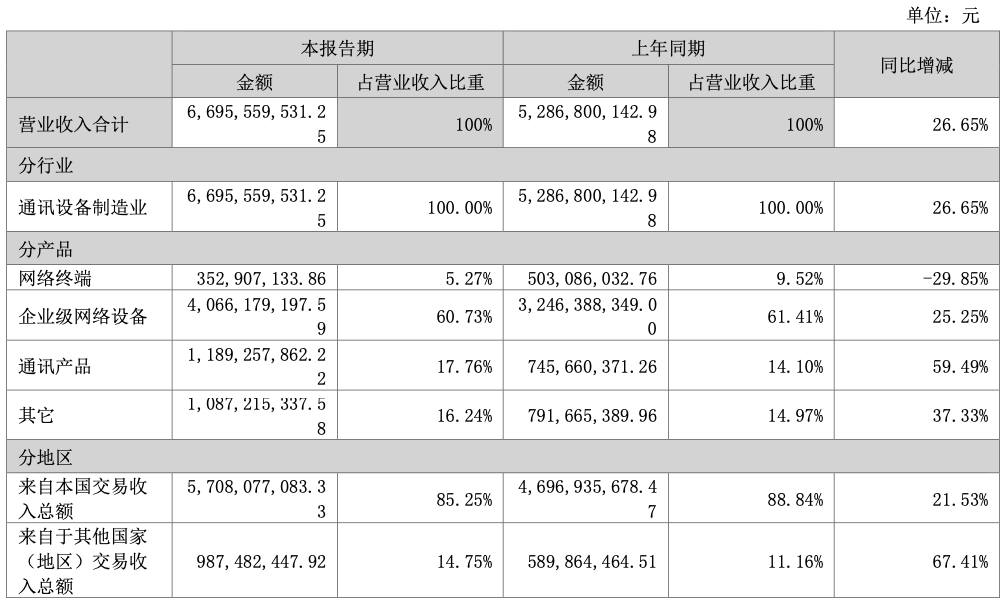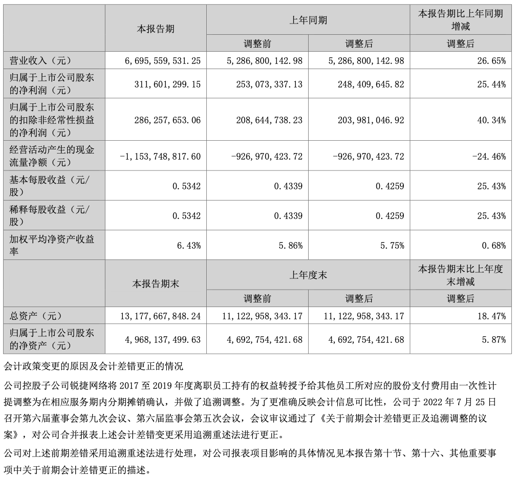 2022年8月25日,星网锐捷发布的《2022年半年度报告》显示:营收 66.96 亿,同比增长 26.65%;净利润 3.12 亿,同比增长 25.44%。