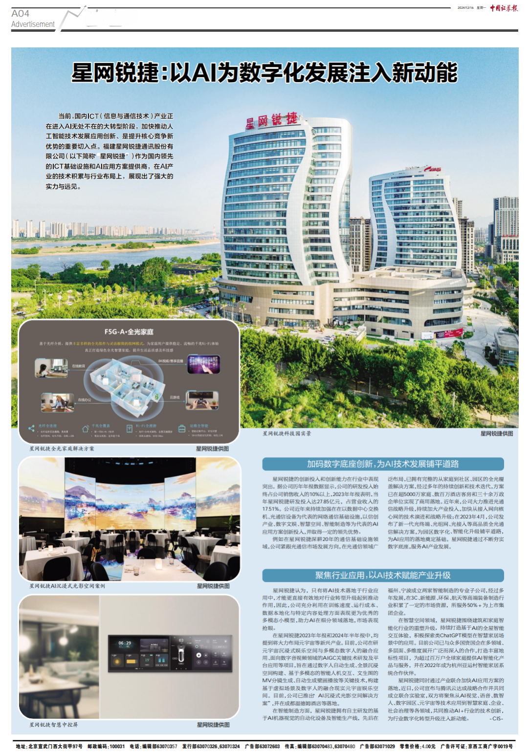 例如在星网锐捷深耕20年的通信基础设施领域,公司紧跟光通信市场发展方向,在光通信领域广泛布局,已拥有完整的从家庭到社区、园区的全光覆盖解决方案,经过多年的持续创新和技术迭代,方案已在超5000万家庭、数百万酒店客房和三十余万政企单位实现了商用落地。近年来,公司大力推进光通信战略升级,持续加大产业投入,加快从接入网向核心网的技术演进和战略升级;在2023年4月,公司发布了新一代光终端、光组网、光接入等高品质全光通信解决方案,为园区数字化、智能化升级铺平道路,为AI应用的落地奠定基础。星网锐捷通过不断夯实数字底座,服务AI产业发展。