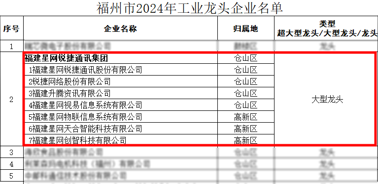 近日,福州市人民政府公布了 2024 年工业龙头企业名单,福建星网锐捷及旗下多家企业获评“大型龙头”企业,第四年荣登榜单。这一成绩不仅是对星网锐捷及其子公司综合实力的高度认可,也彰显了公司在数字经济多个领域的引领地位。