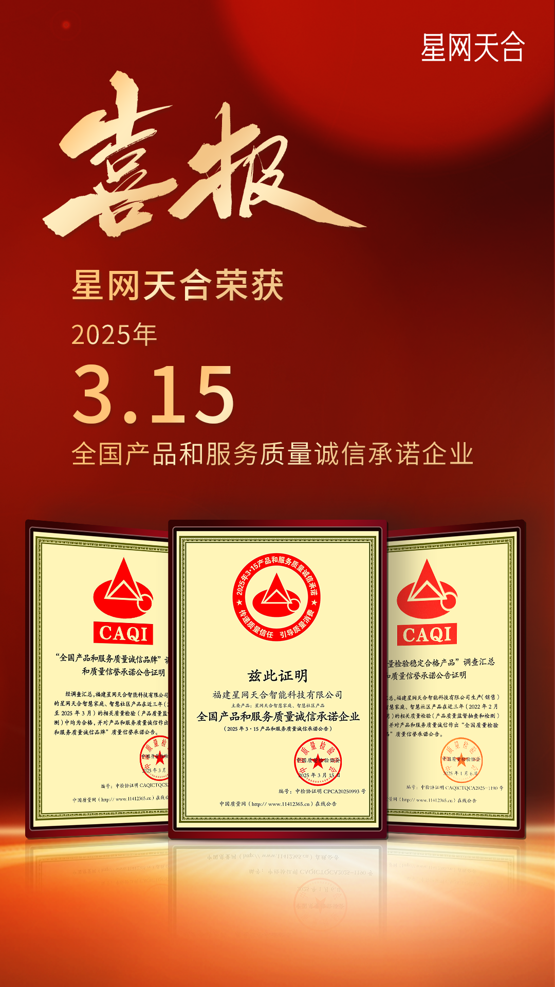 近日,集团成员企业星网锐捷权属星网天合在中国质量检验协会开展的2025年3·15国际消费者权益日“产品和服务质量诚信承诺”主题活动中,凭借在产品品质、服务质量、行业高质量发展等方面的突出表现,被授予了“全国产品和服务质量诚信承诺企业”、“全国产品和服务质量诚信品牌”及“全国质量检验稳定合格产品”等荣誉称号。