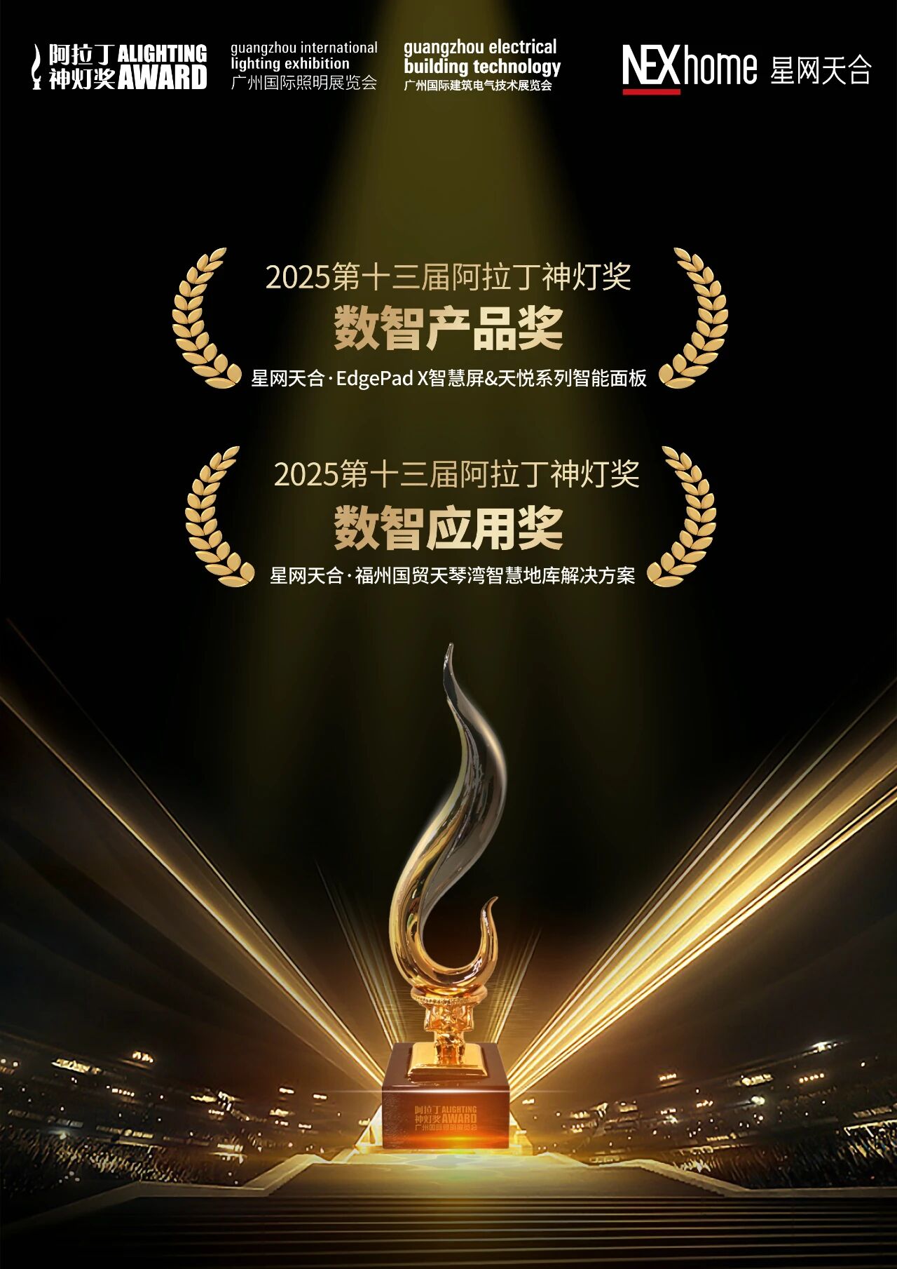 2025年6月9日到12日,第30届广州国际建筑电气技术展览会(GEBT 2025)在中国进出口商品交易会展馆圆满举办。星网锐捷旗下星网天合携KNX智能家居解决方案亮相展会现场,并在同期举行的第十三届阿拉丁神灯奖·数智奖评选中,凭借创新产品设计与智慧地库场景落地能力,一举斩获阿拉丁神灯奖「数智产品奖」与「数智应用奖」双项殊荣。