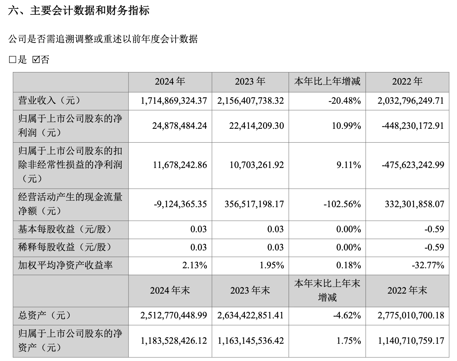据财报披露,2024年,梦洁股份营业收入为17.15亿元,同比下降20.48%;净利润2487.85万元,同比增长10.99%;经营活动产生的现金流量净额为-912万元,同比下降102.56%。