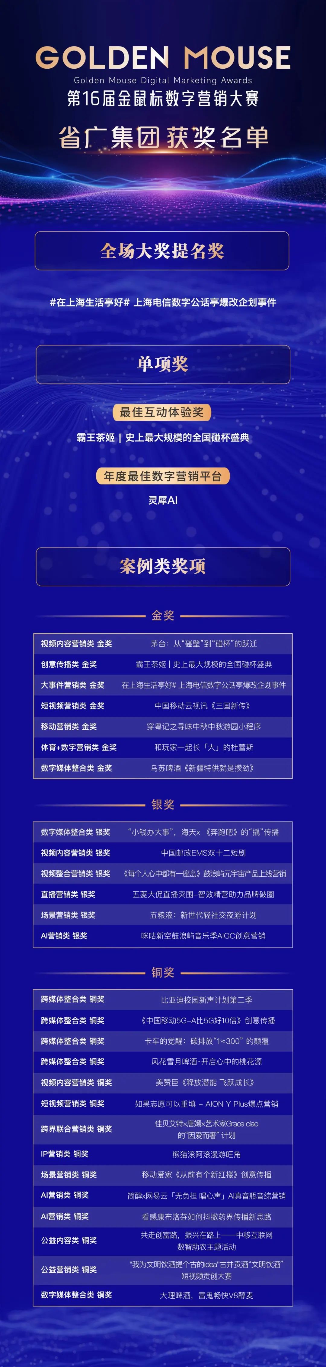 此次省广集团在金鼠标数字营销大赛斩获佳绩,印证了集团作为行业领军者的深厚积淀与创新势能。未来,省广集团将持续深耕创意传播与数字营销,在广告营销的前沿领域开拓更多可能性,携手客户共赴数字时代价值增长新征程!