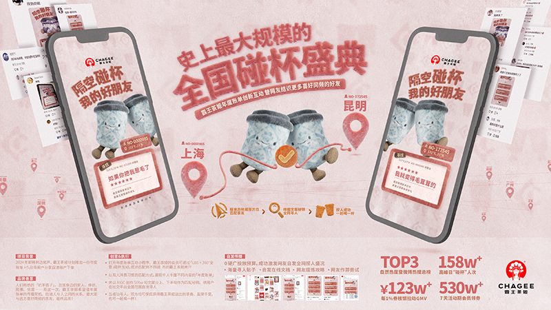 省广集团携手霸王茶姬以“温暖碰杯”为核心创意,打造霸王茶姬2024年度账单:用户进入小程序即可通过LBS+360°全景技术与全国匹配用户实时虚拟碰杯;系统基于消费习惯生成千人千面账单;同时借助AIGC生成500万句拆分文案作为“社交密码”,引导用户自发寻人互动。活动融合Jellycat萌系视觉与“隔空领券共饮”激励机制,成功将年度账单升级为品牌情感连接器,既强化“温暖陪伴”心智,又通过社交裂变实现用户增长与消费转化双赢。