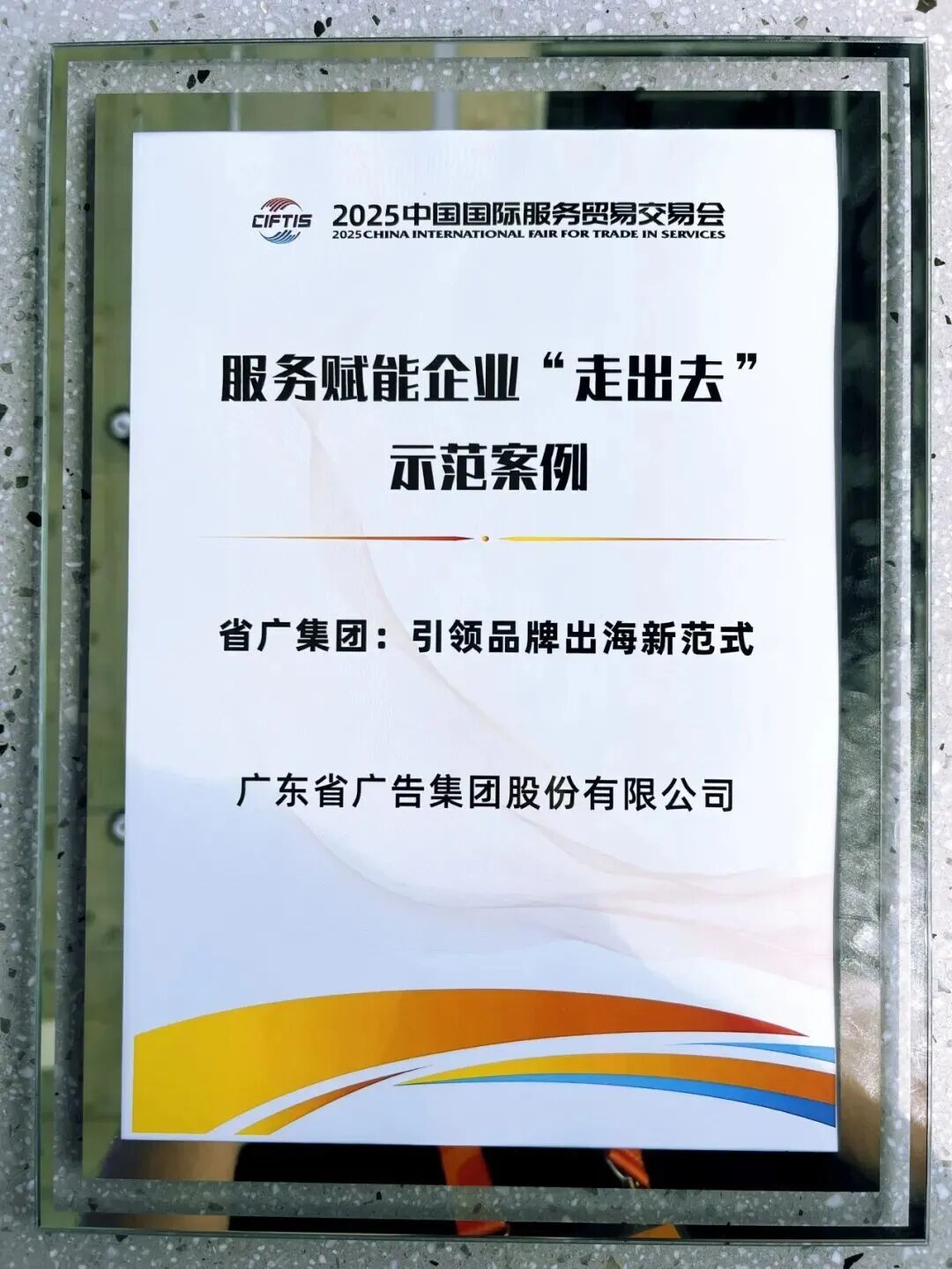 在这个全球瞩目的舞台上,省广集团凭借在全球化营销服务领域的突出表现与创新实践,成功入选“2025服贸会服务赋能企业‘走出去’示范案例”,并在大会颁奖环节中正式获颁证书。