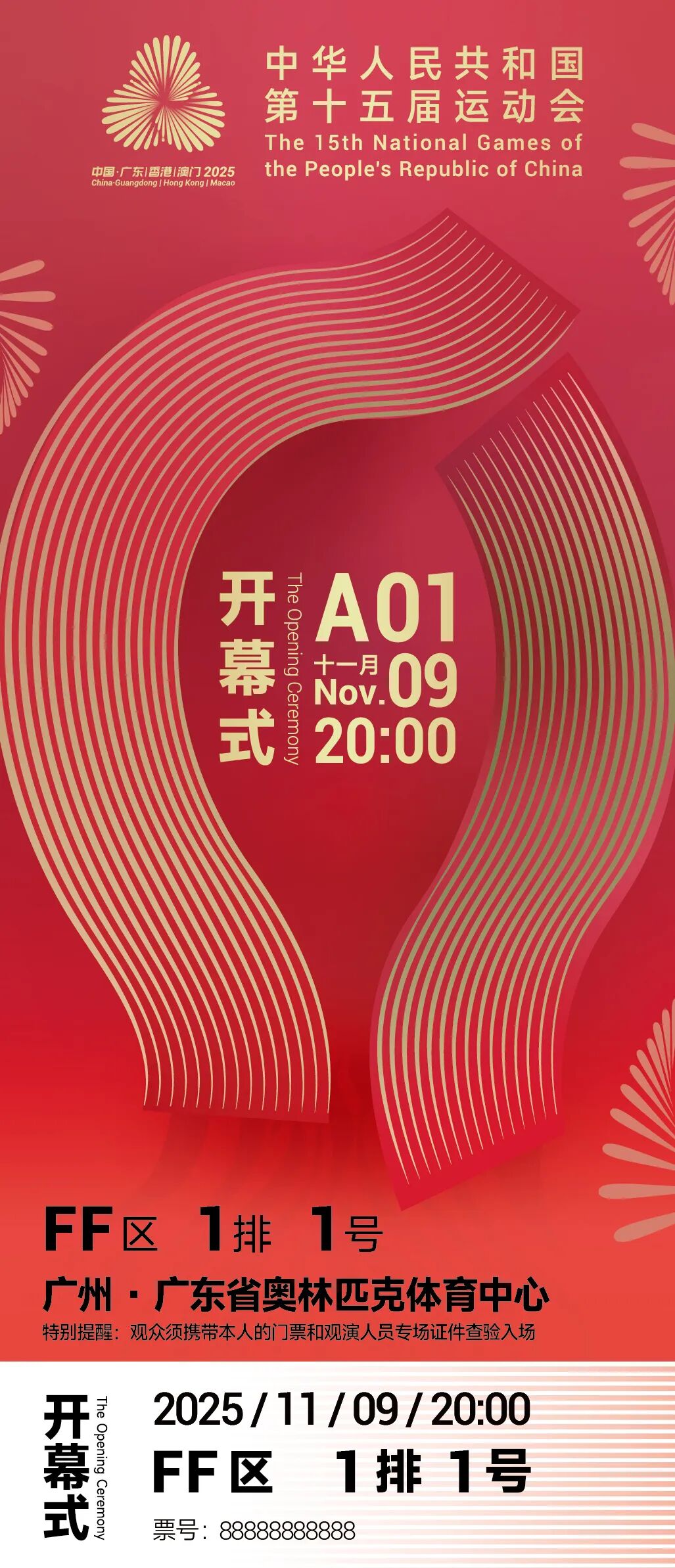 开幕式门票设计以“融汇传统、面向未来”为核心理念,系统融入岭南文化精髓与湾区国际风貌,从“利是·立式·历史·立势”四个维度,成功诠释了赛会精神与地域气质。此外,本次开幕式门票在防伪技术方面吸收借鉴近几年大型综合性国际赛事开幕式门票的防伪工艺,集成应用多种特殊防伪工艺,使每一张门票不仅是全运的通行证,更成为承载全运记忆、独具艺术价值的藏品。