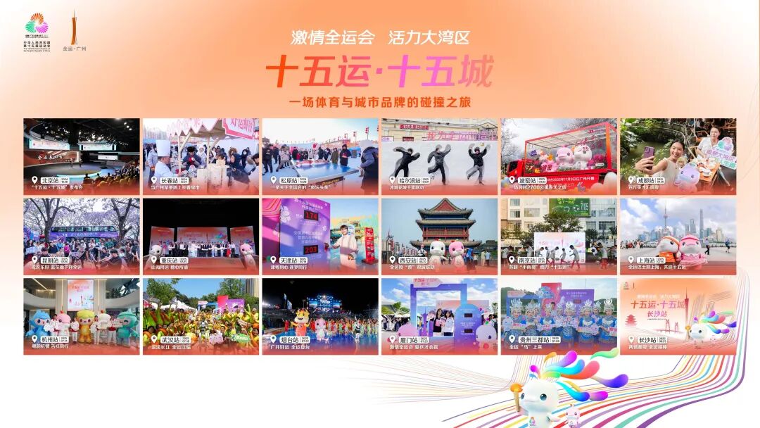由十五运会和残特奥会广州赛区执委会主办、 省广集团 全程策划执行的“十五运·十五城”大型城市联动活动,堪称一场中国城市的顶级创意联名。活动历时279天,以广州为原点,以创意为纽带,串联起全国15座重要体育赛事之城和3座特色城市。象征全运精神的“好运”跨越两万余公里接力传递,谱写了一曲动人的“十五运·十五城”创意故事。
