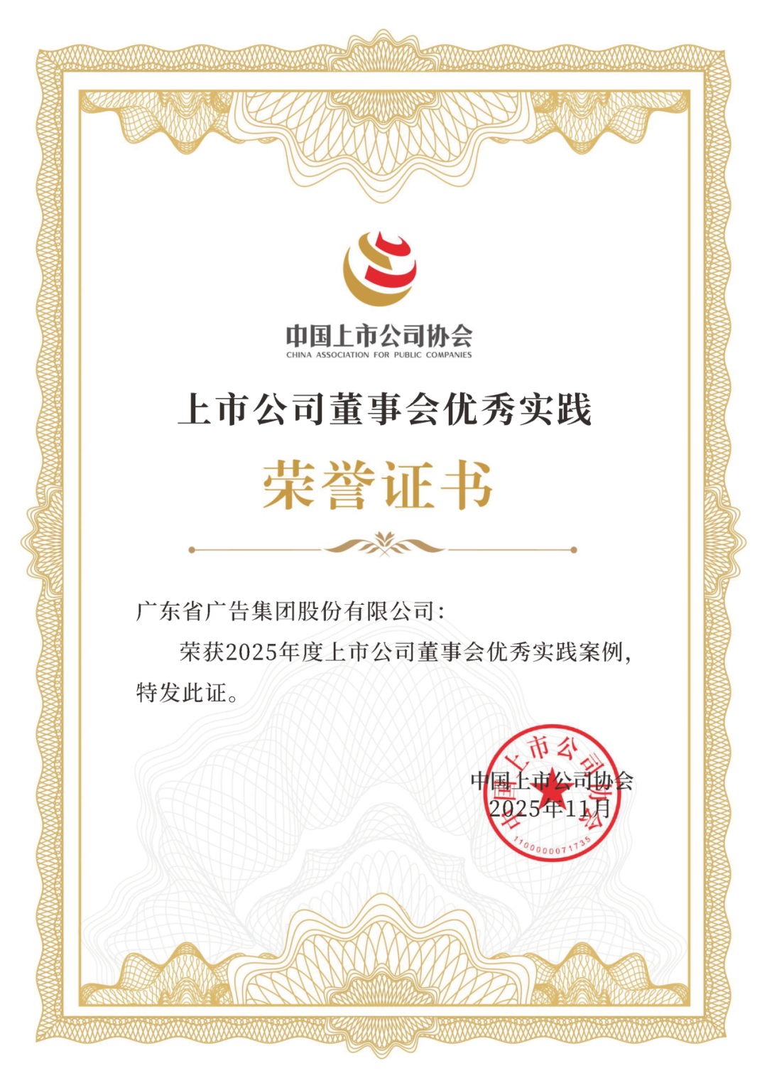 近日, 中国上市公司协会 “2025上市公司董事会最佳实践案例”评选结果正式揭晓, 省广集团 凭借在公司治理领域的优秀实践与成效,荣获 中国上市公司协会 “2025上市公司董事会优秀实践案例”。
