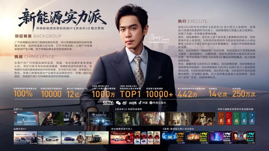 广汽传祺推出E系列三款插电混动车型,并以传祺新能源的全新形象推出市场。为快速建立知名度,打开市场局面,让用户对传祺新能源产生兴趣,赋予传祺品牌全新的新能源形象,省广集团以实力派演员张若昀作为传祺新能源代言人,开展了为期一年的整合营销传播——通过春晚登车、共创神曲、车展联动及系列剧集热点结合,助力品牌实现曝光总次数高达14亿次,成功打响品牌知名度。