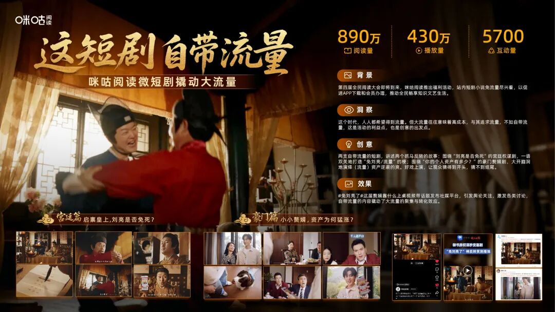 第四届全民阅读大会即将到来,咪咕阅读推出福利活动,站内短剧小说免流量尽兴看,以促进APP下载和会员办理,推动全民畅享知识文艺生活。对此,省广集团用两支自带流量的短剧,讲述两个抓马反转的故事让观众猜得到开头,猜不到结尾。相关话题发布社媒平台,即引发舆论关注,激发各类讨论自带流量的内容撬动了大流量的聚集与转化效应。