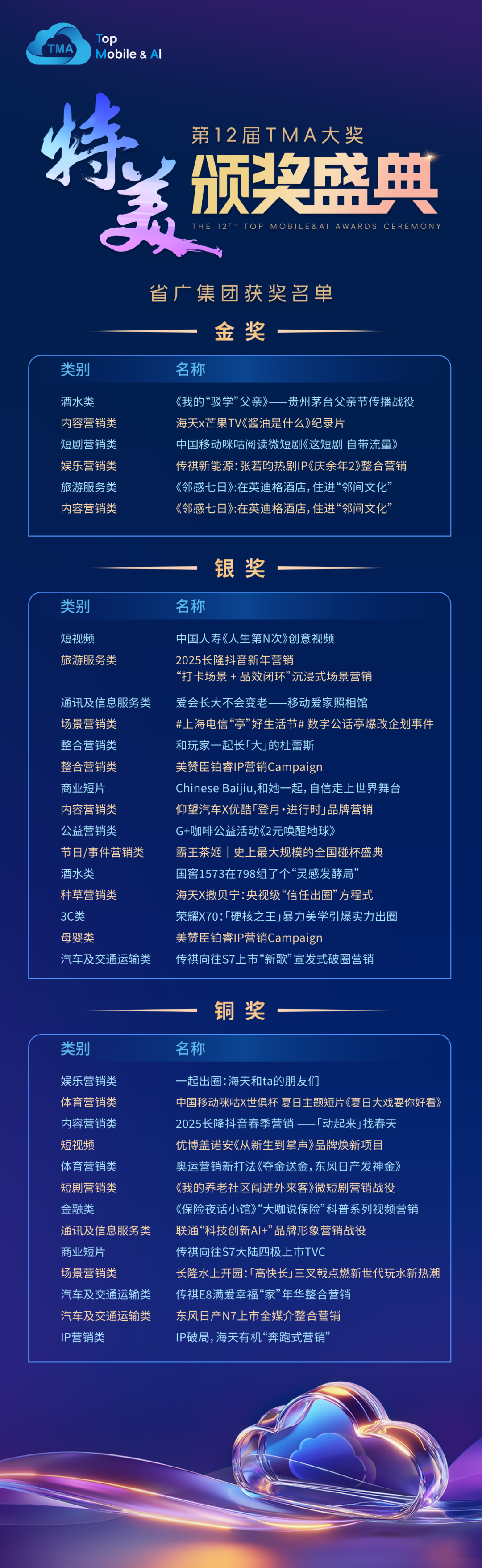 凭借在整合营销领域的专业实践与多项突出成果,省广集团荣获第12届TMA大奖6金15银13铜共计34项大奖,满载而归!