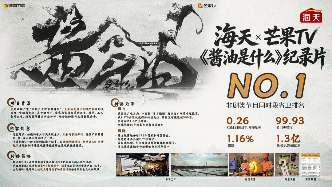省广集团为海天酱油打造纪录片营销项目《酱油是什么》,以科普形式深入现代酱油生产一线,通过短视频拼接、动画与AI等创新手法,展现酱油的酿造历史与现代化生产。传播上聚焦知识科普、产业面貌与文化IP,联动权威媒体,成功深化了海天的品牌内涵并实现了广泛的文化传播。最终该片实现非剧类节目同时段省卫排名第一的好成绩。