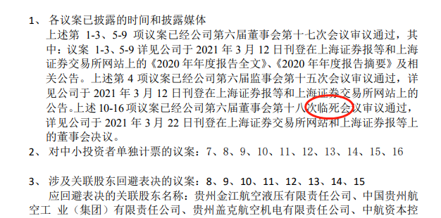 2021年3月,中航重机(证券代码:600765)发布《关于2020年年度股东大会增加临时提案的公告》,其中出现了“上述10-16项议案已经公司第六届董事会第十八次临死会议审议通过”的字样。