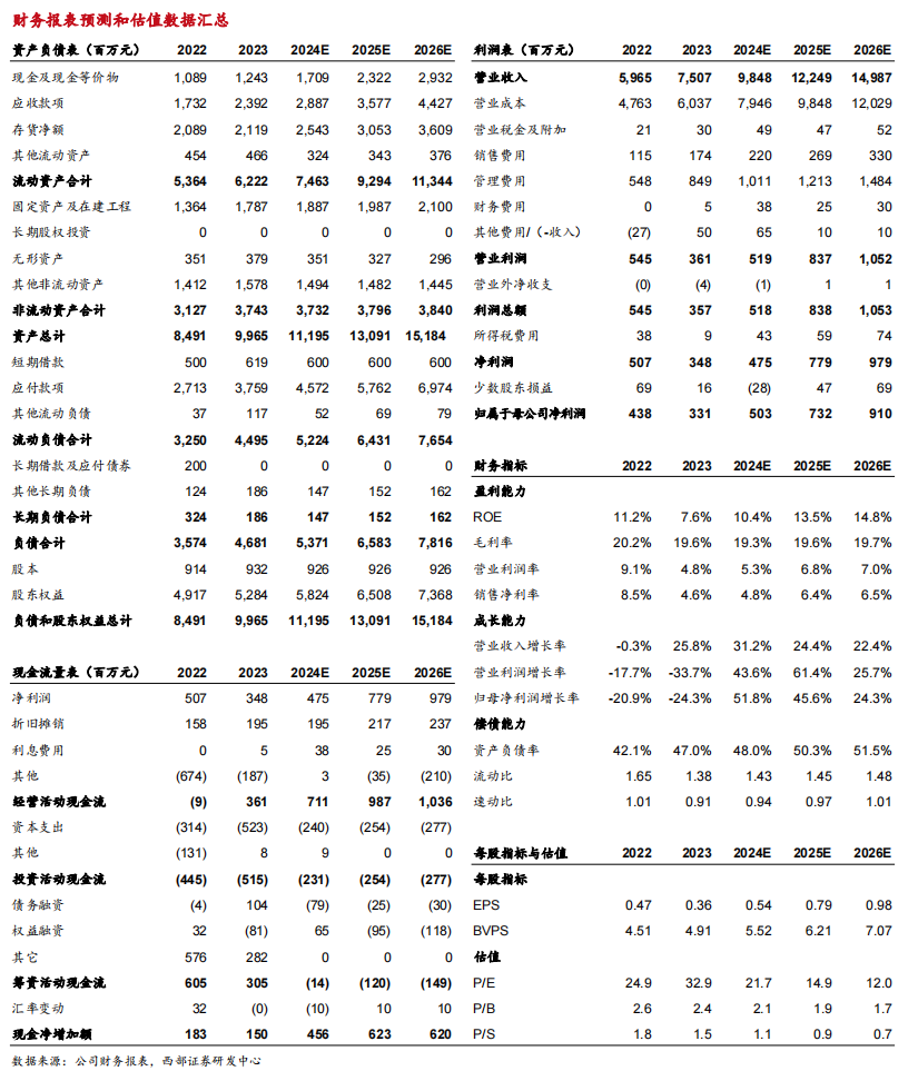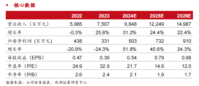 投资建议:预计公司 2024-2026 年归母净利润 5.0/7.3/9.1亿元,对应 PE 分别为22/15/12X,维持“买入”评级。
