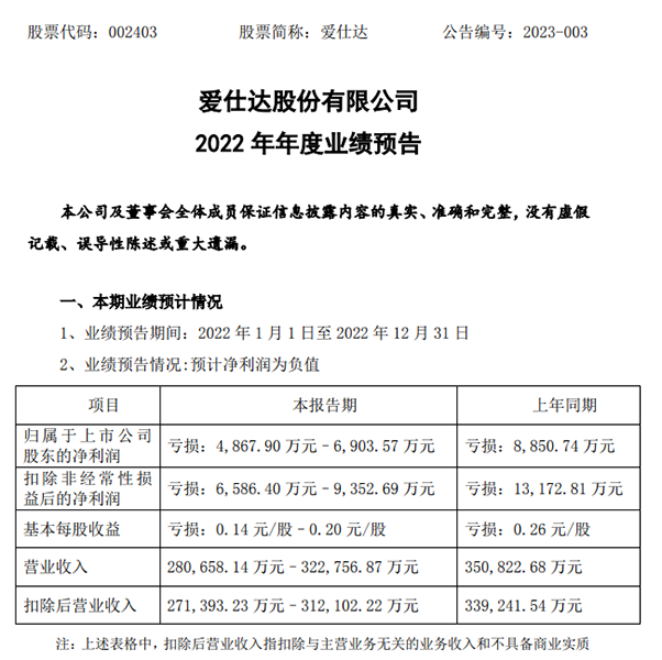 1月30日晚,爱仕达发布2022年年度业绩预告。公告显示,爱仕达预计2022年年度实现归属于母公司所有者的净利润亏损4867.90万元–6903.57万元;上年同期为亏损8850.74万元。