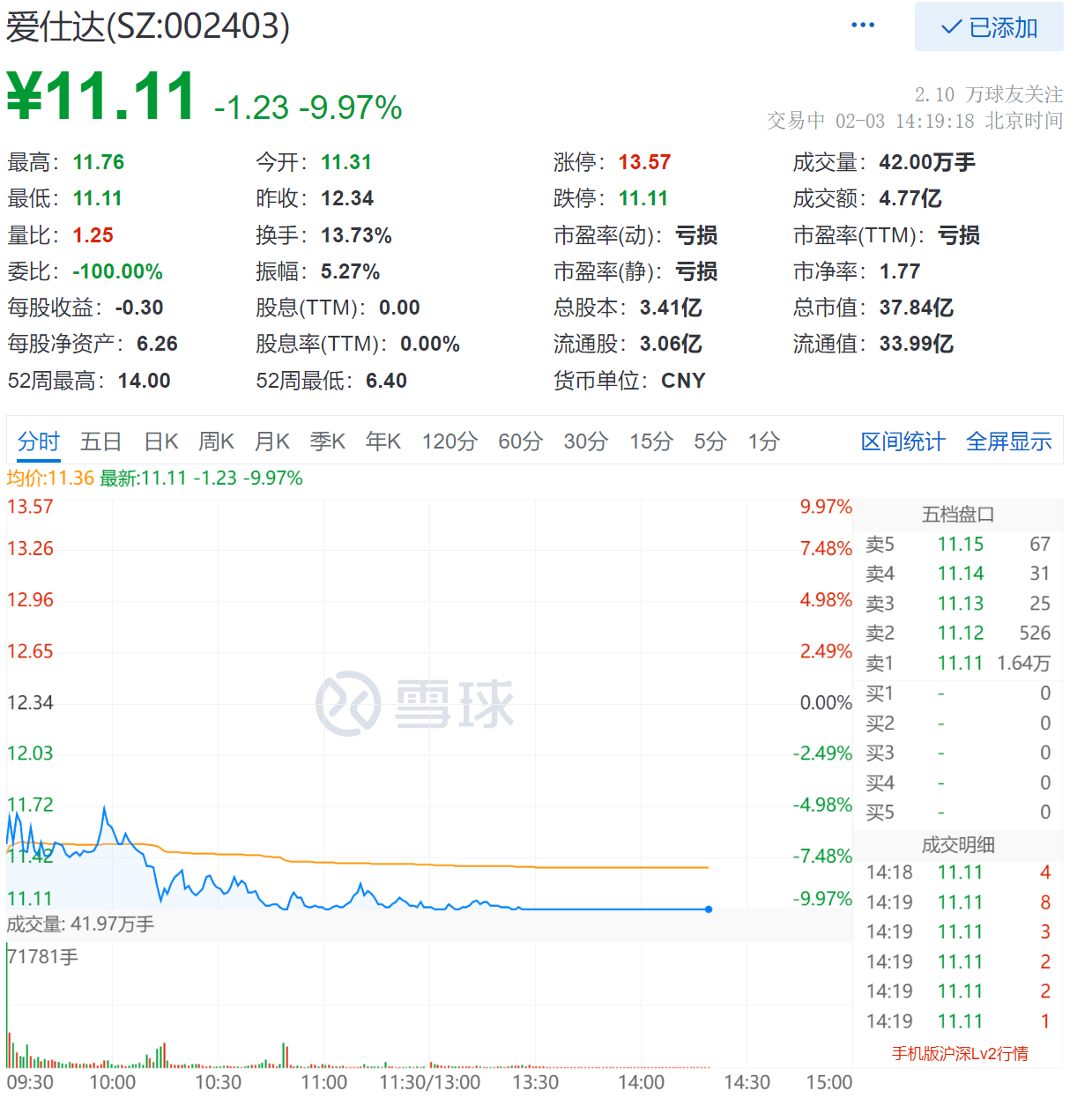 2月3日,截至14:19,爱仕达(SZ:002403)跌停,下跌9.97%,现报11.11元,成交额为4.77亿元,总市值为37.84亿元。