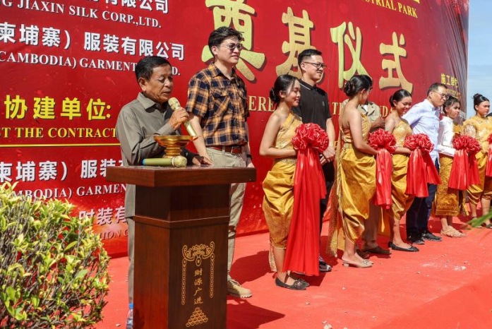 6月19日柬埔寨时间上午8时38分,嘉欣丝绸(柬埔寨)工业园暨金云绣(柬埔寨)服装有限公司奠基仪式隆重举行。