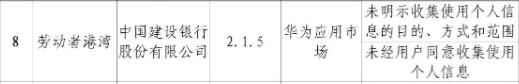 本次通报显示,由中国建设银行股份有限公司(“建设银行”,601939.SH)运营的劳动者港湾APP(应用版本2.1.5,应用来源:华为应用市场)存在未明示收集使用个人信息的目的、方式和范围;未经用户同意收集使用个人信息的问题。