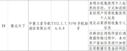 此外,由中寰卫星导航通信有限公司运营的寰运天下APP(应用版本T321_1.7.6.0.0,应用来源:vivo手机助手)存在未明示收集使用个人信息的目的、方式和范围;未经用户同意收集使用个人信息;违反必要原则收集个人信息;在移动应用程序前后端数据传输过程中,未对用户鉴权信息进行加密;应用数据任意备份风险的问题。