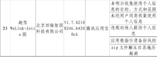 由北京四维智联公司有限公司运营的趣驾WeLink-Jetta版APP(应用版本V1.7.02108246.b4200c6,应用来源:腾讯应用宝)存在未明示收集使用个人信息的目的、方式和范围;未经用户同意收集使用个人信息;违规向他人提供个人信息;应用数据任意备份风险;zip文件解压目录遍历漏洞的问题。