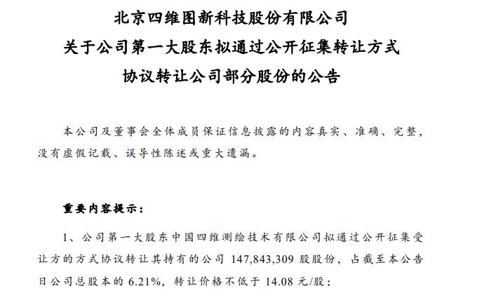3月14日,四维图新发布公告称,公司第一大股东中国四维测绘技术有限公司拟通过公开征集受让方的方式协议转让其持有的公司1.48亿股股份,占截至公告日公司总股本的6.21%,转让价格不低于14.08元/股。本次公开征集转让的实施将导致公司第一大股东发生变更。